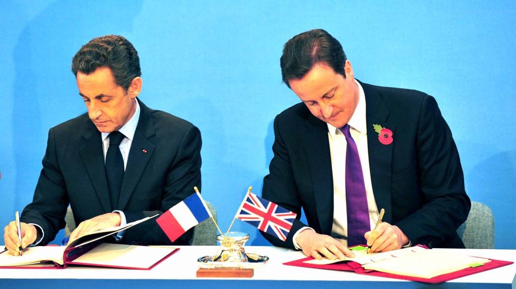 Prezydent Francji Nicolas Sarkozy i premier Wielkiej Brytanii David Cameron podpisują traktaty podczas szczytu Wielka Brytania-Francja w Lancaster House w Londynie 2 listopada 2010