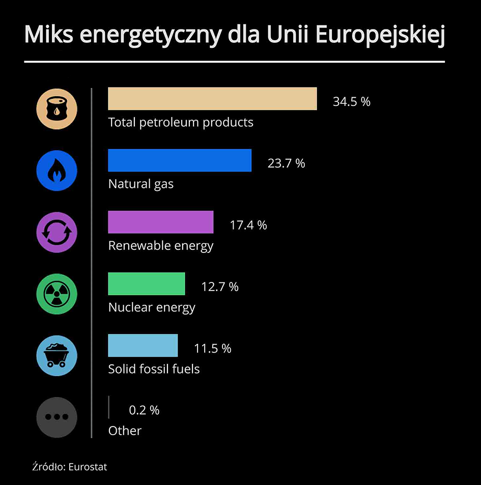 W 2022 r. UE wyprodukowała około 40% własnej energii (spadek w porównaniu z 44% w 2019 r.), natomiast 60% (wzrost w porównaniu z 58% w 2020r.) pochodziło z importu.